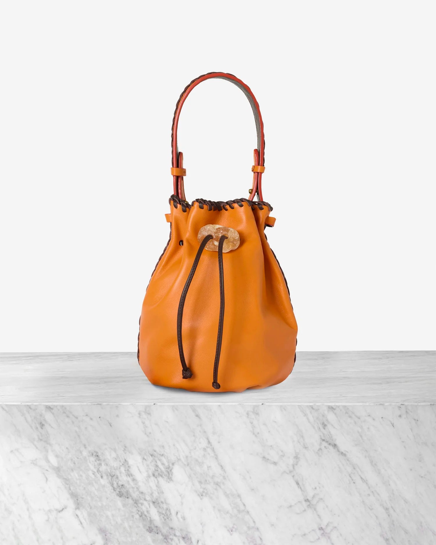 The NIRMALA bucket bag is IACOBELLA’s signature creation. It’s created in suede and embellished with a CRYSTAL that doubles as an enclosure. It features a removable strap for adjustable length.