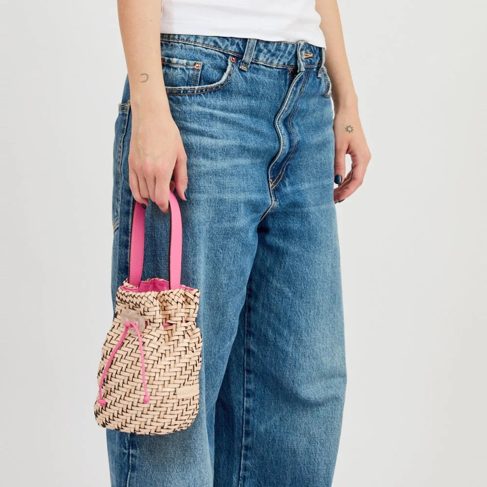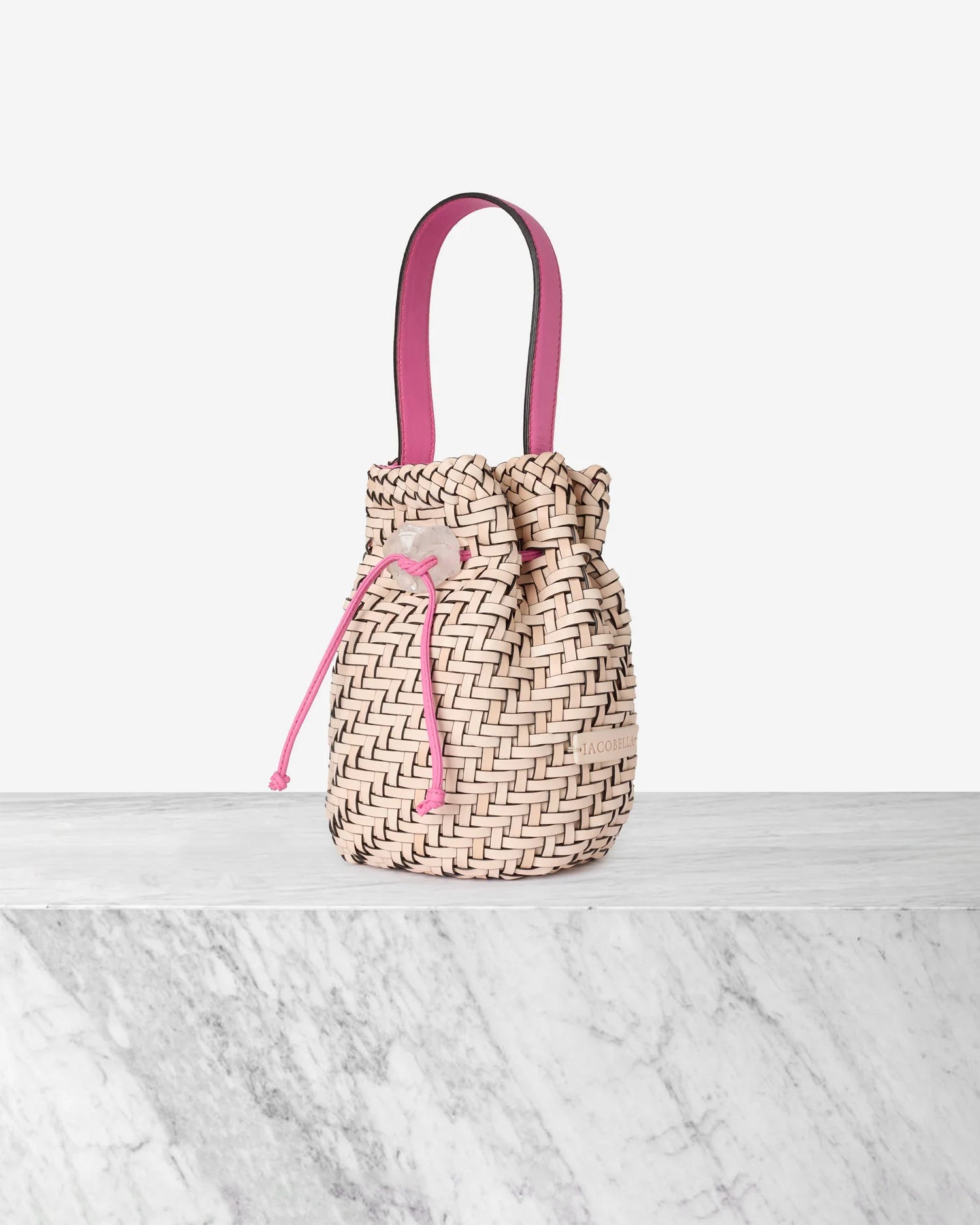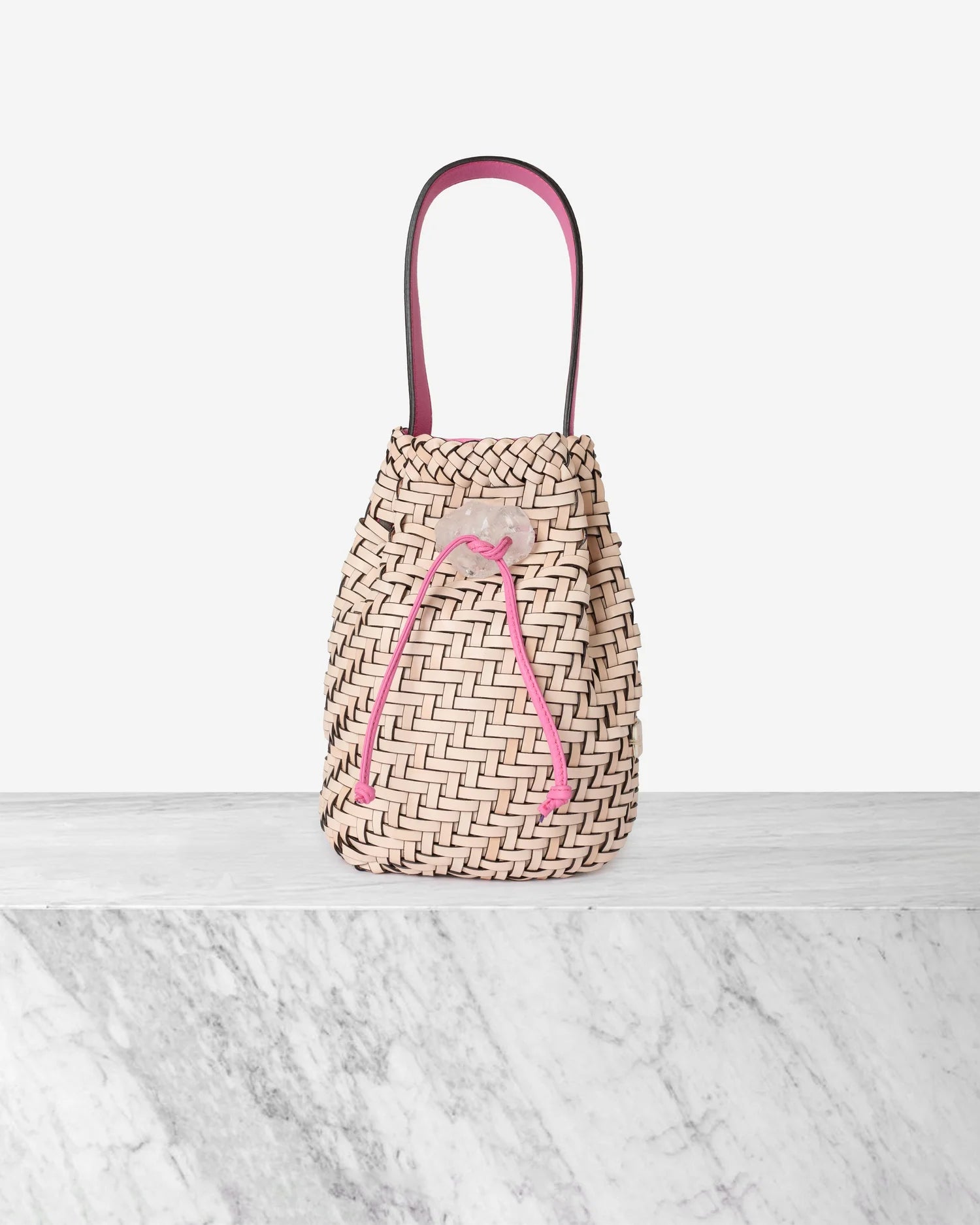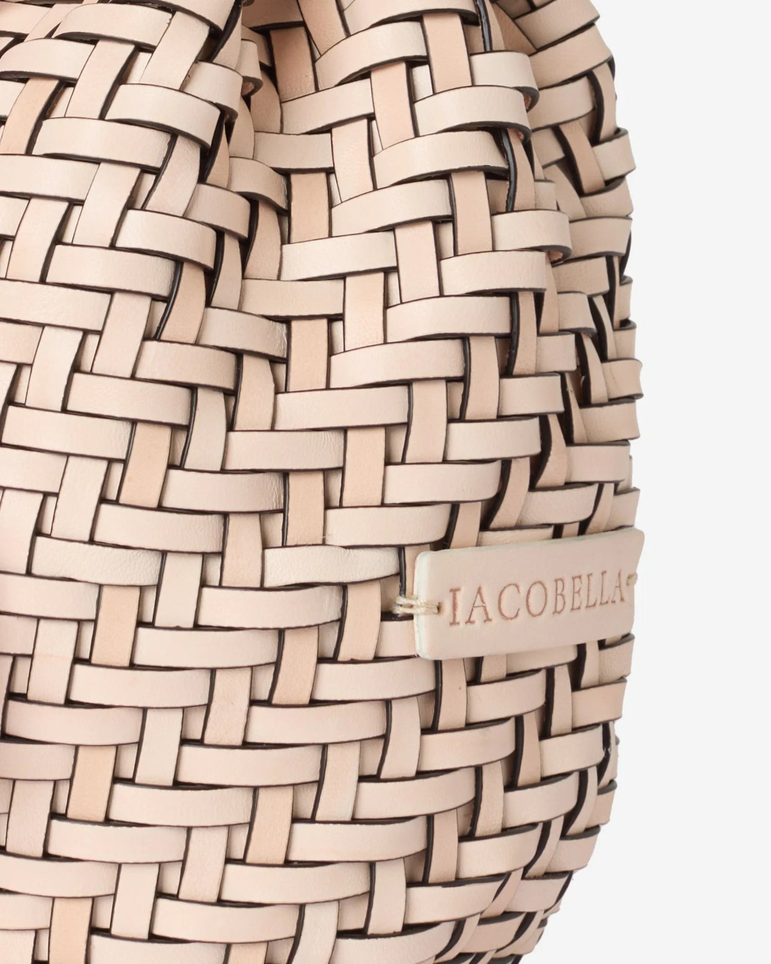 The NIRMALA bucket bag is IACOBELLA’s signature creation. It’s handwoven in vacchetta leather, and is embellished with an CRYSTAL that doubles as an enclosure. The bag has a short handle and a long shoulder strap.