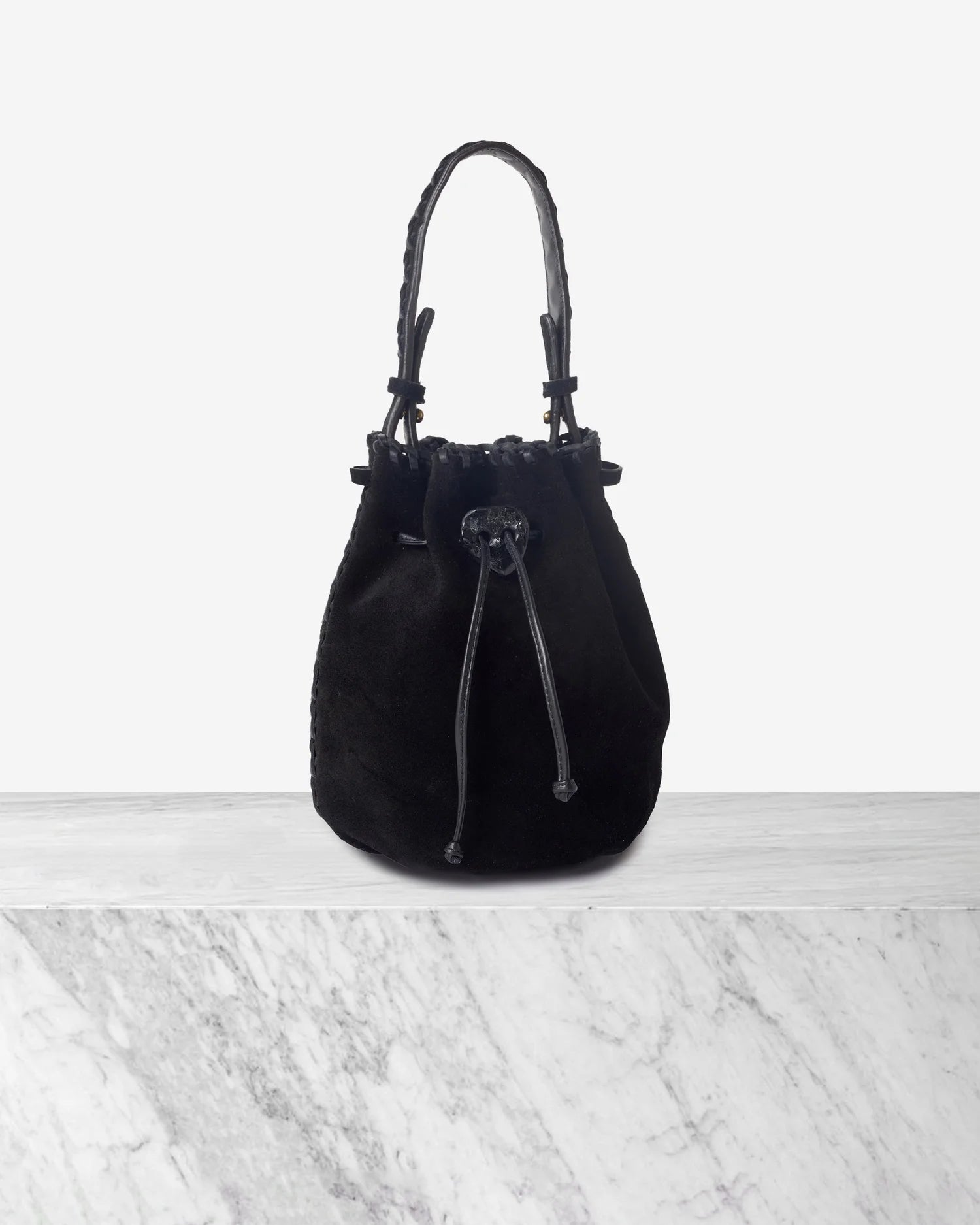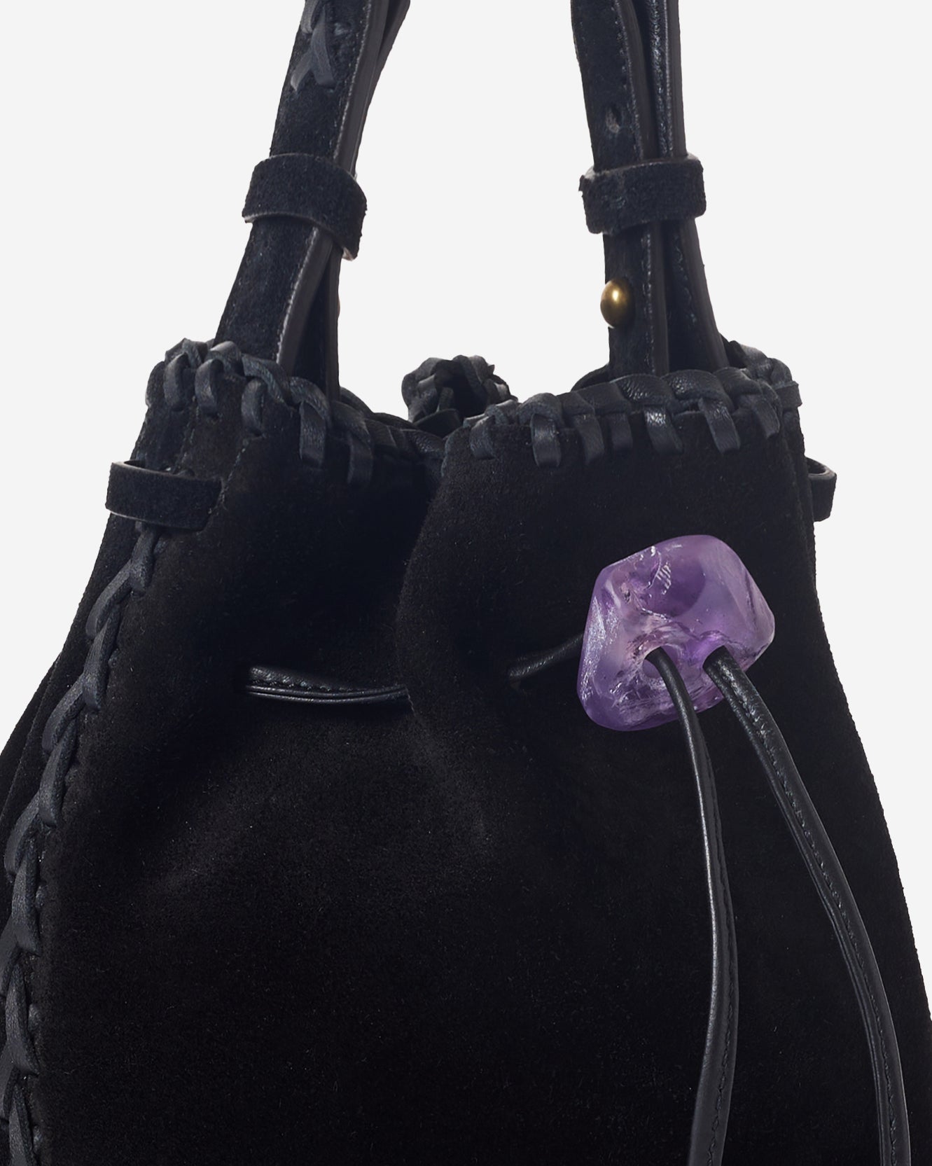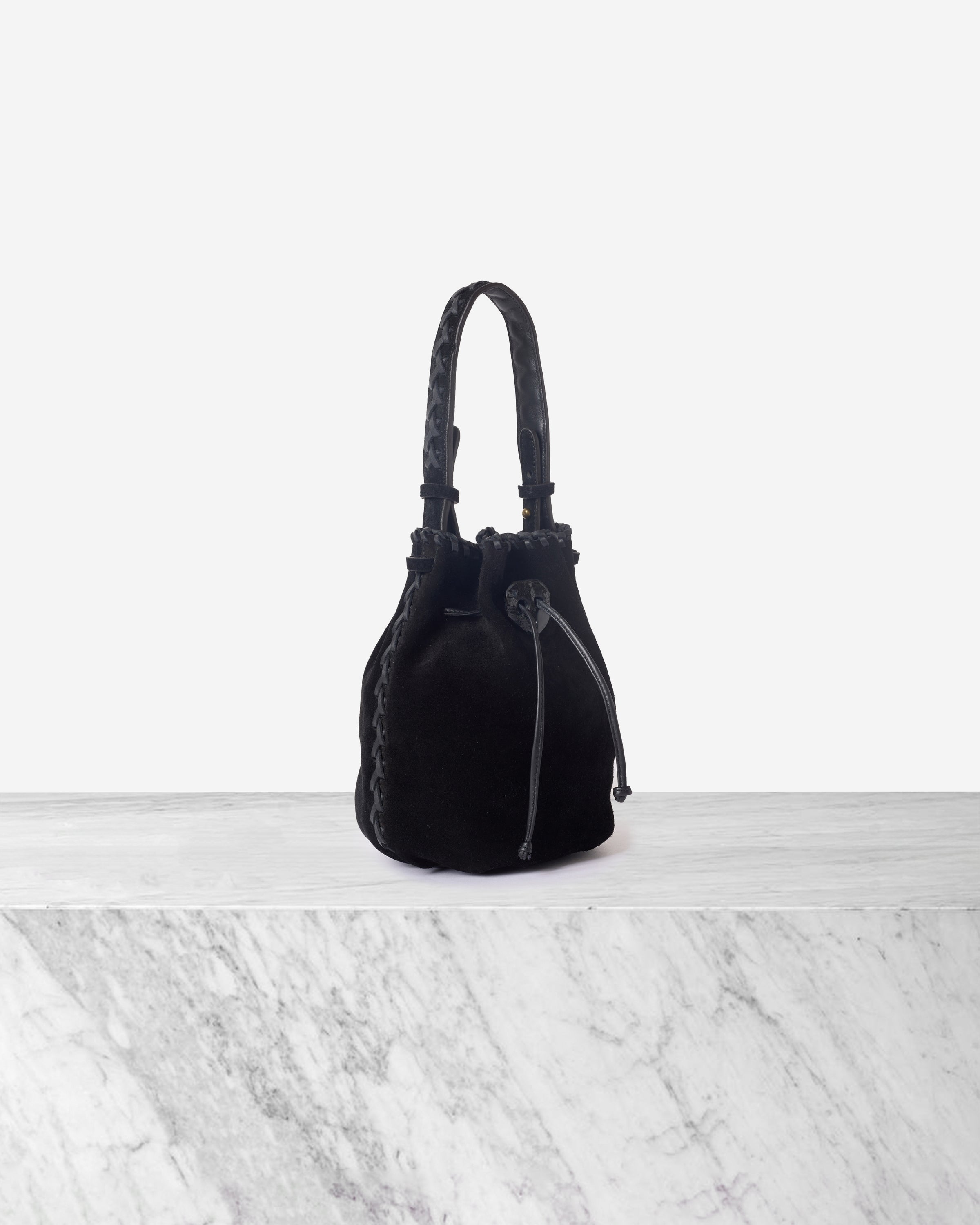 The NIRMALA bucket bag is IACOBELLA’s signature creation. It’s created in suede and embellished with a CRYSTAL that doubles as an enclosure. It features a removable strap for adjustable length.