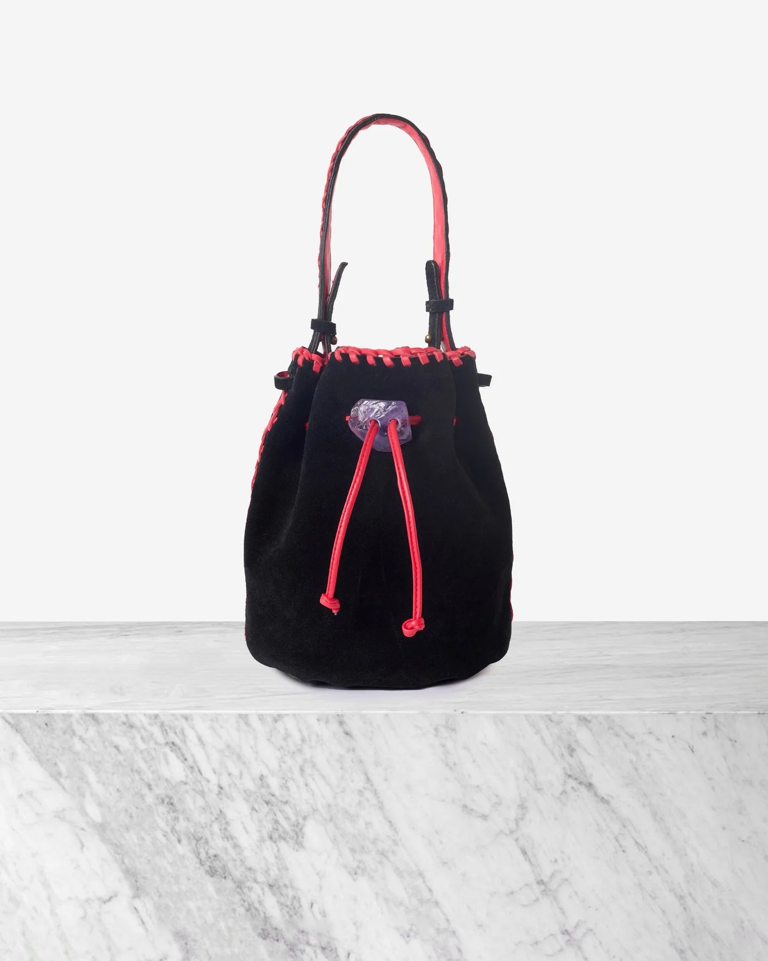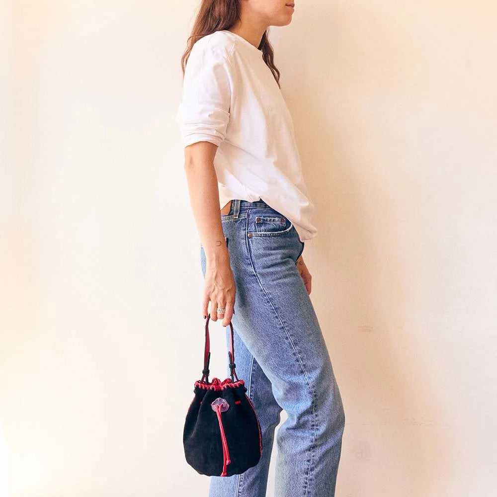 The NIRMALA bucket bag is IACOBELLA’s signature creation. It’s created in suede and embellished with a CRYSTAL that doubles as an enclosure. It features a removable strap for adjustable length.