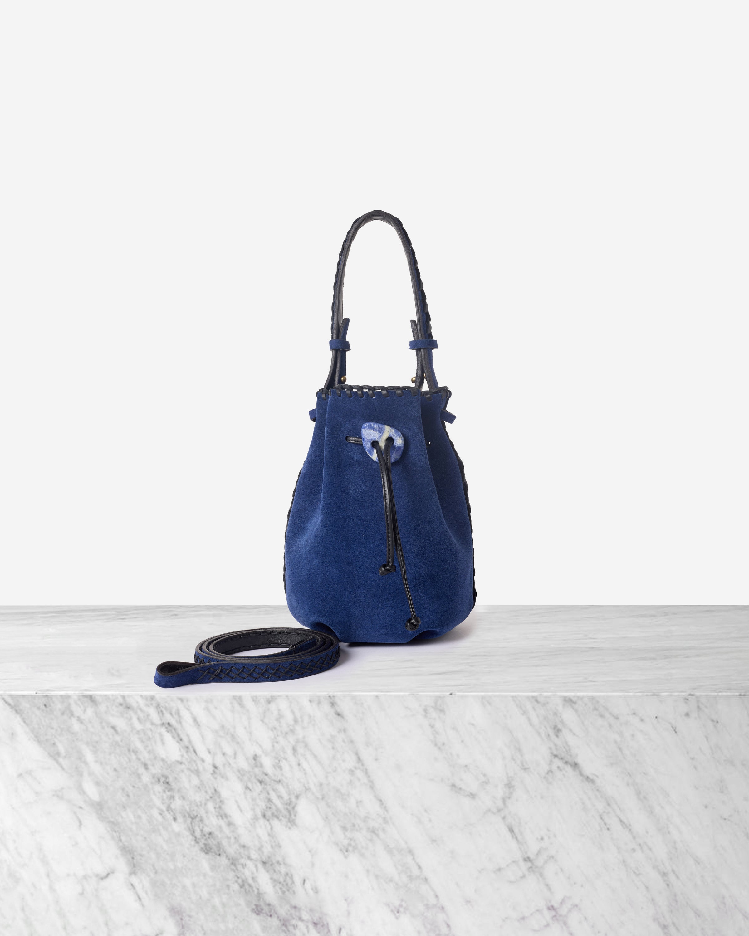 The NIRMALA bucket bag is IACOBELLA’s signature creation. It’s created in suede and embellished with a CRYSTAL that doubles as an enclosure. It features a removable strap for adjustable length.