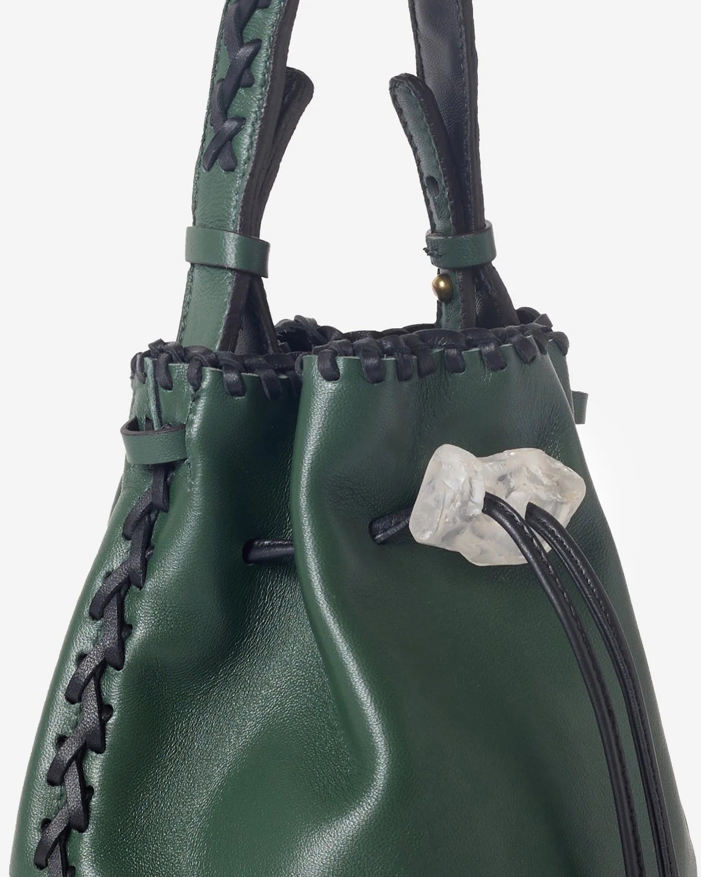 The NIRMALA bucket bag is IACOBELLA’s signature creation. It’s created in suede and embellished with a CRYSTAL that doubles as an enclosure. It features a removable strap for adjustable length.